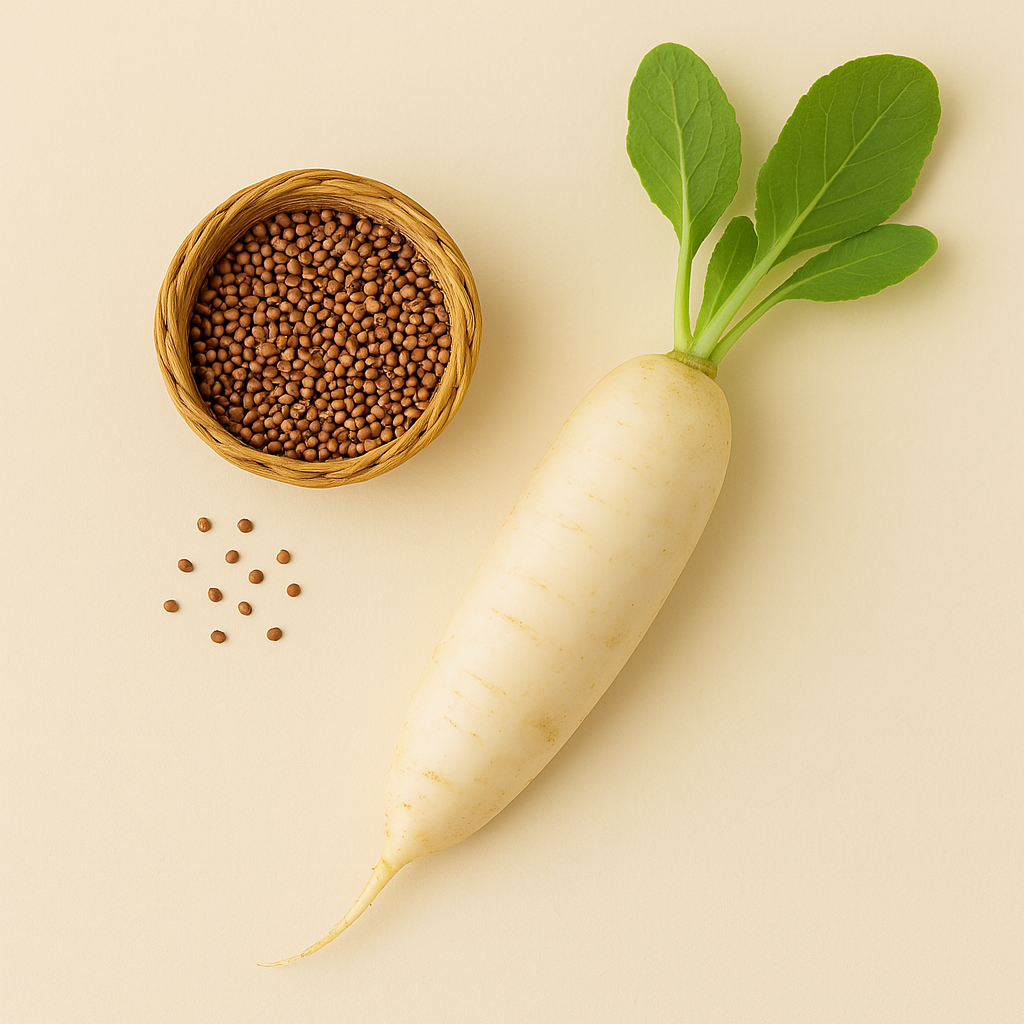 Our daikon seed extract is cold-pressed from sustainably grown, non-GMO daikon radish seeds in the USA. It is processed using eco-friendly mechanical extraction, with no solvents or heat — preserving both nutrient integrity and environmental purity.