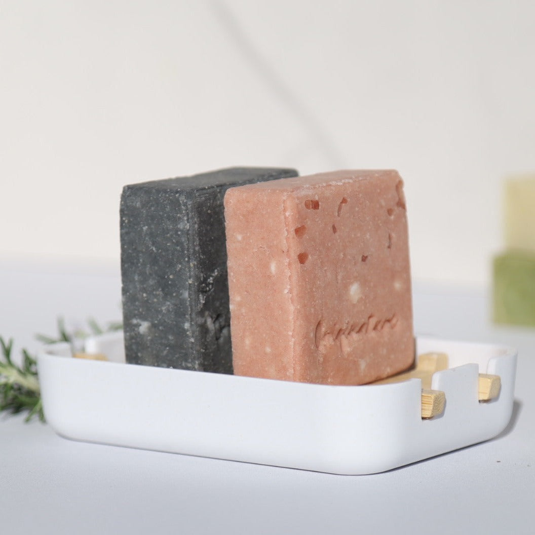 Bamboo Soap Dish: provides an ideal home for your shampoo and conditioner bars. Made with bamboo and starch, it offers a toxic-free and odor-free alternative, surpassing plastic and rusty tin options.