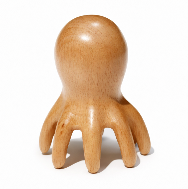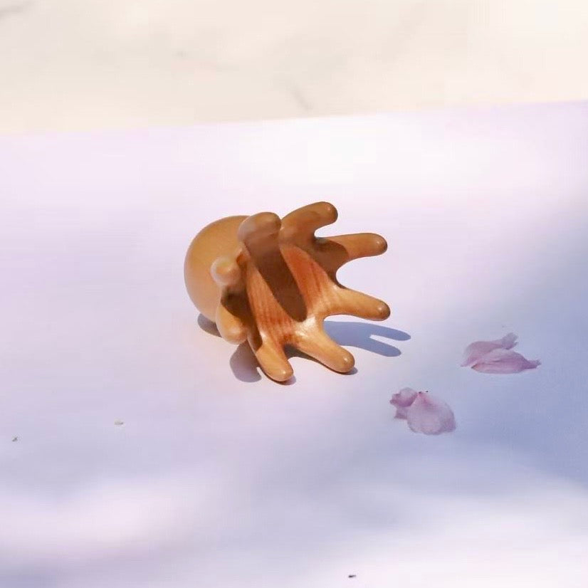 This wooden octopus scalp massager is a handcrafted grooming tool made from premium natural wood, featuring a whimsical octopus shape with a smooth palm-fit head and polished tentacle-like prongs designed to deliver a gentle yet effective scalp massage experience.